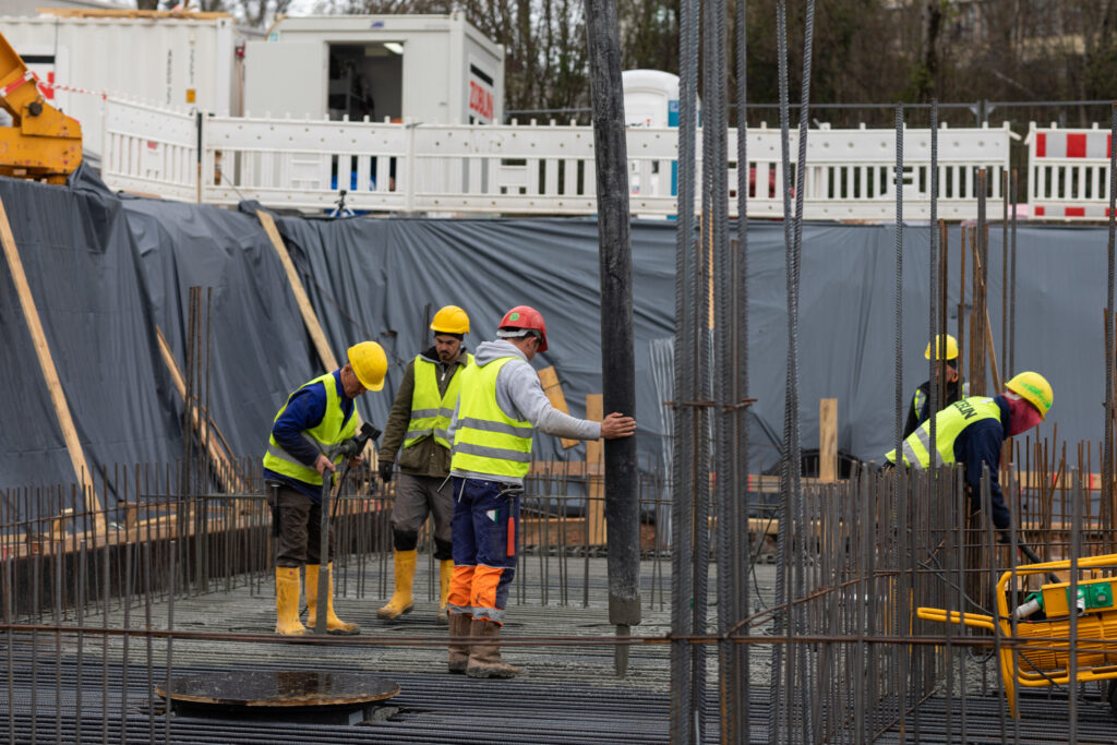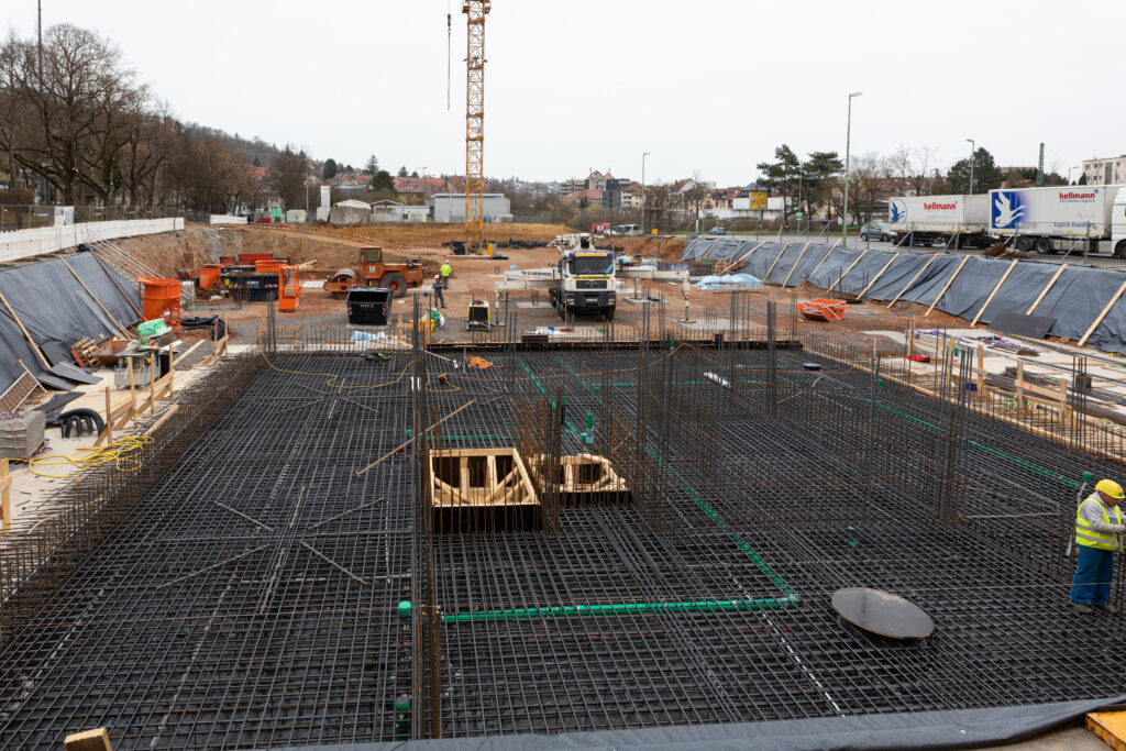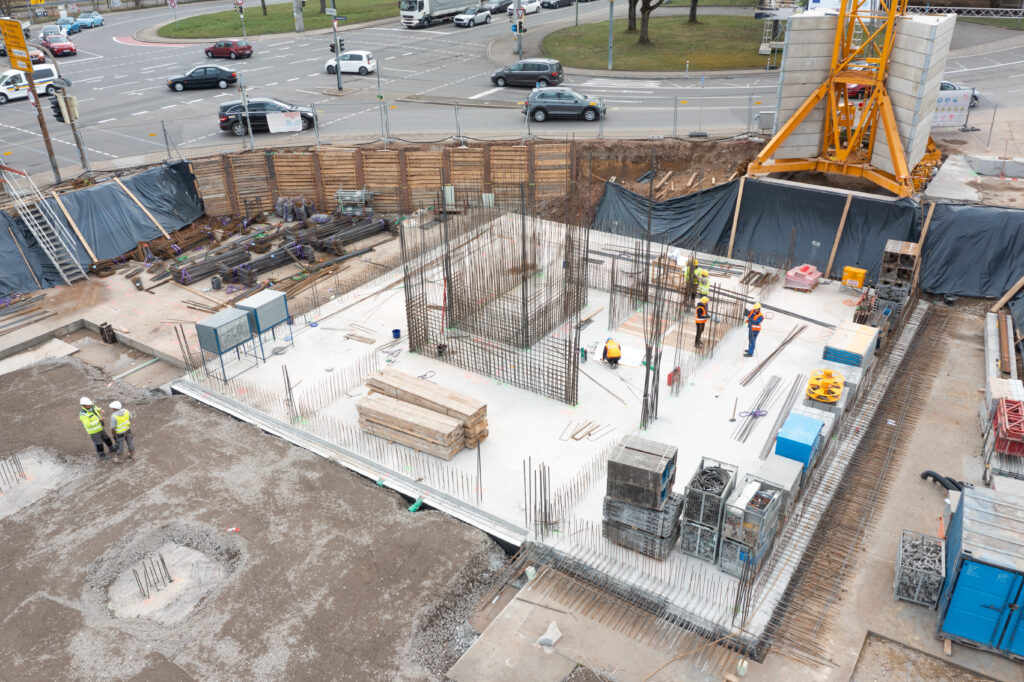 Dort, wo bald das Hybrid-Holzhochhaus nach oben wachsen wird, ragen mittlerweile 51 Bohrpfähle aus Stahlbeton bis zu 4,5 m tief ins Erdreich hinein.